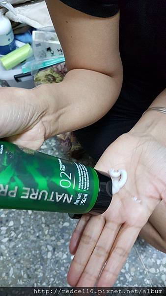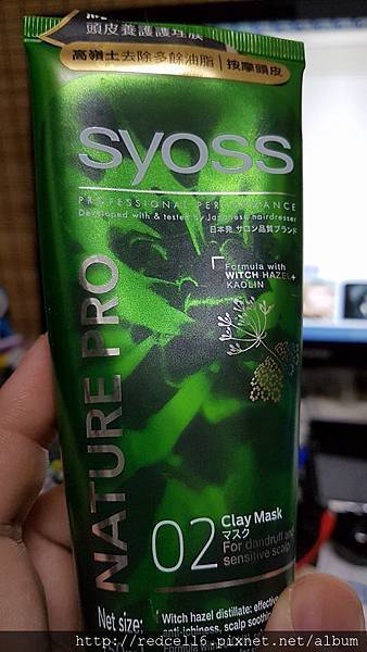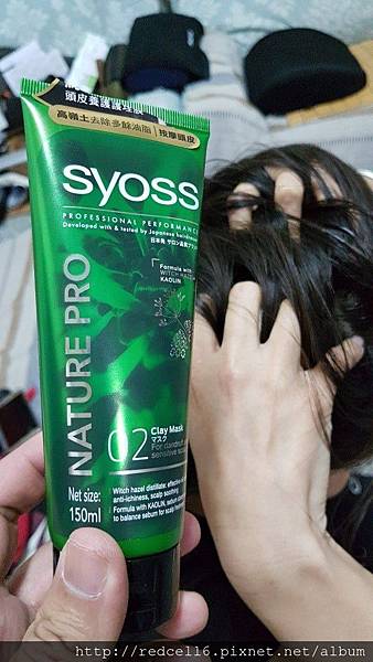 【▼】擠取適量之Syoss絲蘊植萃頭皮養護護理膜乳液於掌心中搓弄。
